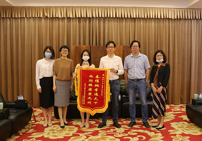 近日,杭州空港宝盛酒店集团办公室主任漏倬颖一行把一面写有“春催桃李遍天下 雨润栋梁竖九州”的锦旗送到我院,感谢学院为企业培养优秀人才。学院党委副书记陈根宝、中旅(旅游)学院领导班子、酒店管理系主任、辅导员出席会议。