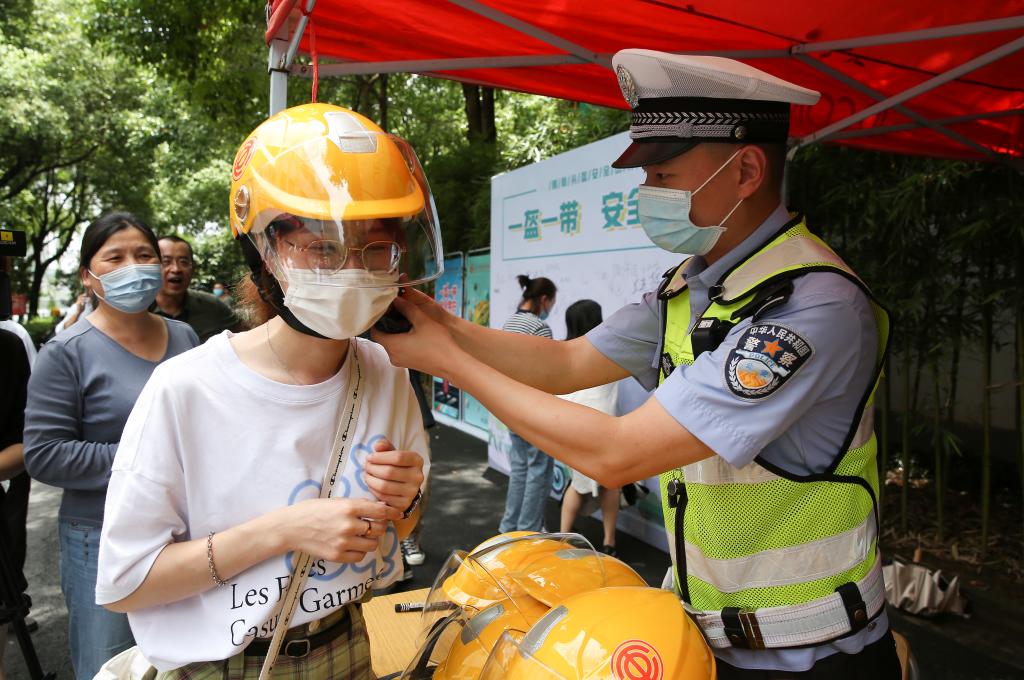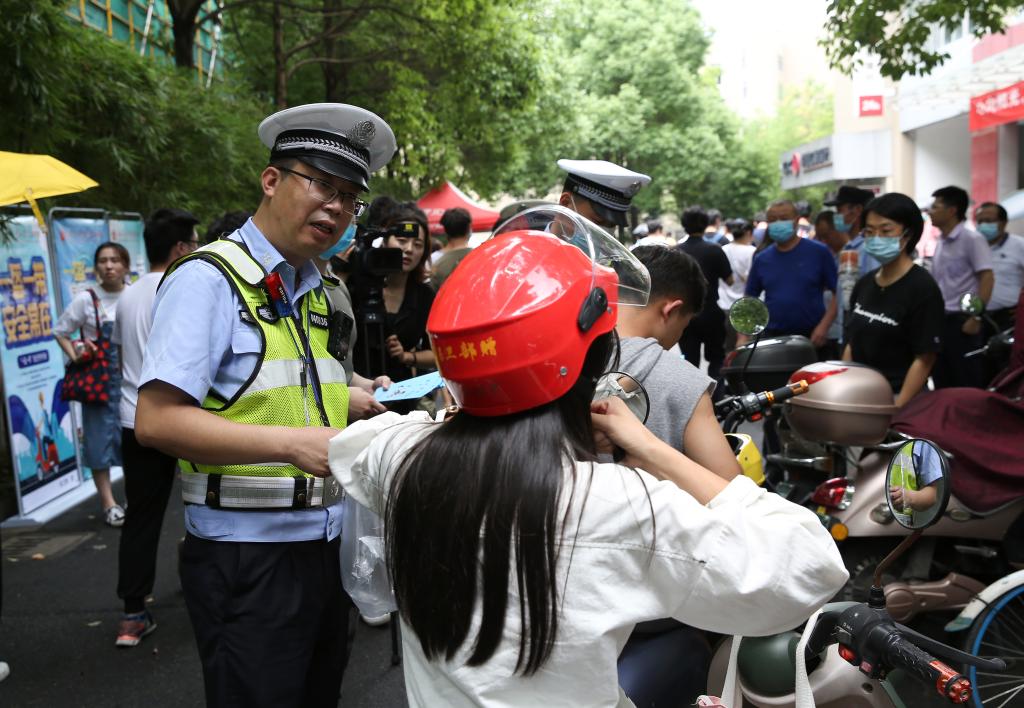 6月11日中午,交通安全宣传周活动启动仪式于学缘堂门口隆重举行,柯桥交警中队应邀参加活动。学生志愿者们在活动现场分发宣传资料,倡导骑行电动车需佩戴安全头盔,不得骑车带人,在校内营造自觉佩戴安全头盔,文明行车的良好风尚。交警在学院主干道针对不佩戴安全头盔、骑电动自行车带人等违章行为进行现场安全教育,引导大家筑牢交通安全意识,抵制交通陋习,自觉遵守交通法律法规;同时在活动现场指导师生正确佩戴头盔,并现场赠送安全头盔,通过与师生积极互动,让师生了解了如何正确戴头盔。本次活动得到了师生员工的积极响应,他们纷纷表示愿意加入“电动车安全文明出行劝导”行列,决不做有损校园文明的行为,并在“一盔一带 安全常在”主题倡议大型喷绘上签名。