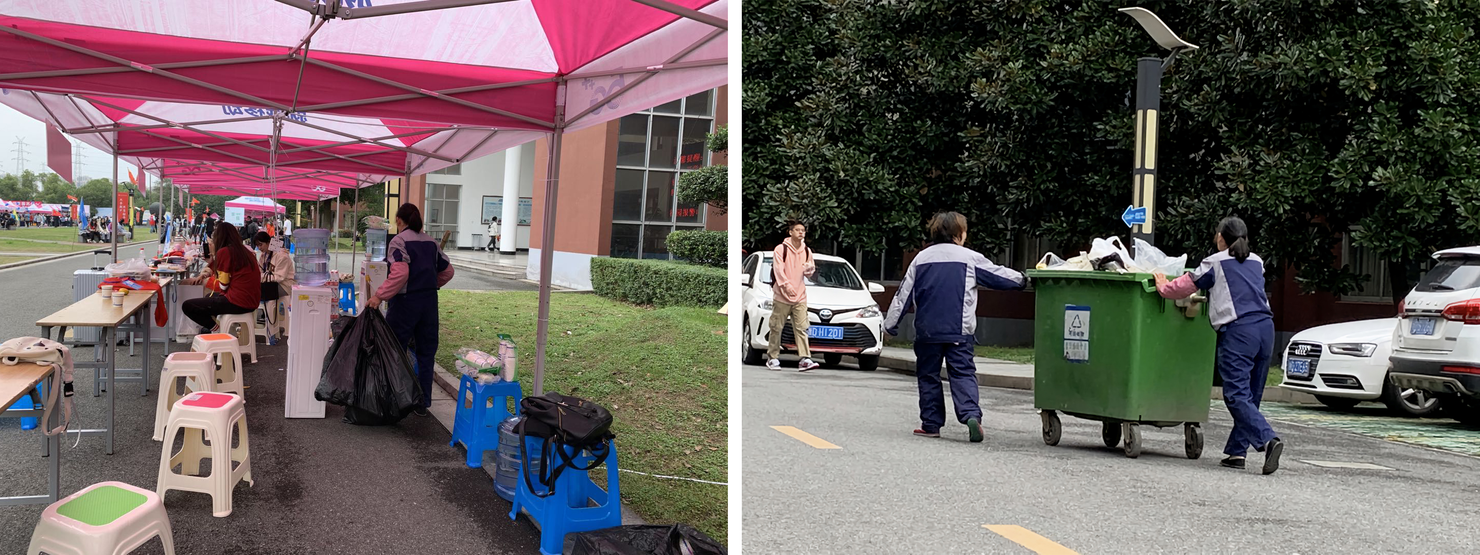 教学区服务部和水电修建部提前做好迎新场地的布置,加班加点完成搭建帐篷、悬挂横幅、摆放桌椅等工作。并且在迎新现场设置流动保洁组,全天候不间断地对校园环境进行巡检及保洁工作,累计清理垃圾200余桶(660升);维修工24小时随时待命,两天共计处理紧急维修100余单。