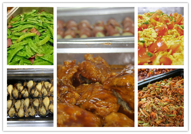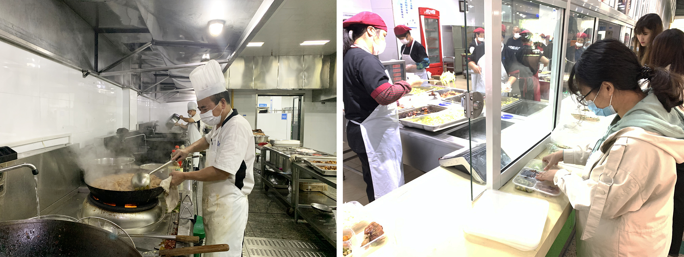 图:食堂员工精心准备菜肴和盒饭
