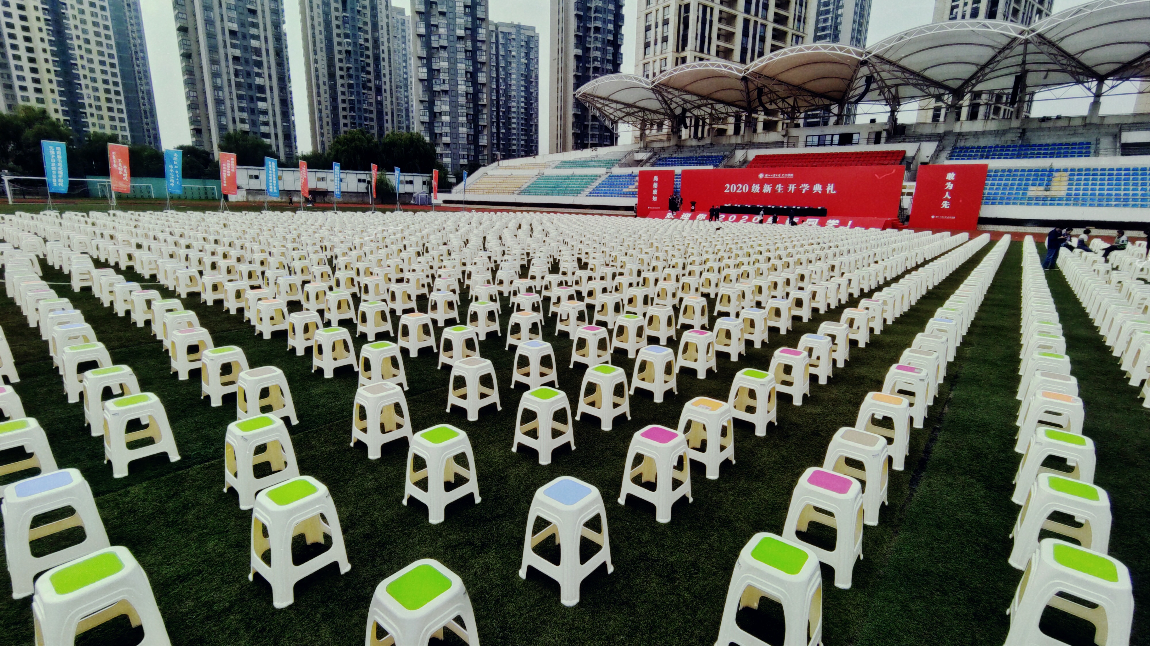 图:员工摆放开学典礼的桌椅