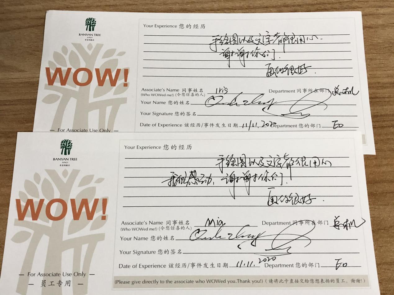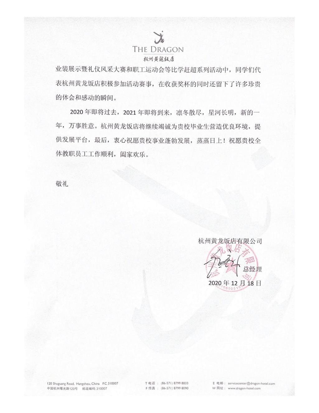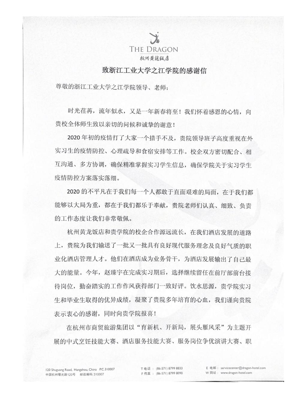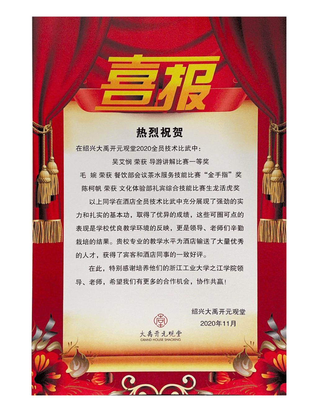感谢信背后是一个个什么样的故事呢?在杭州黄龙饭店工作的赵臻宇同学面对突如其来的疫情,能够以大局为重,敢于直面艰难局面,留任在前厅部前台接待岗位,勤奋踏实的工作作风获得部门的一致好评;在安吉悦榕庄实习的王瑞雪、蒋洁、汪琳艳三位同学在工作中开拓思路、勇于创新,共同设计出一款精致的伴手礼,增强了用户体验感,得到了集团总经理的表扬;在绍兴大禹开元观堂实习的吴艾悯、毛婉、陈柯帆三位同学在“绍兴大禹开元观堂2020全员技术比武中取得了优异的成绩。其中,吴艾悯获得导游讲解比赛一等奖,充分展现了我院学生扎实的专业技能和实践能力。