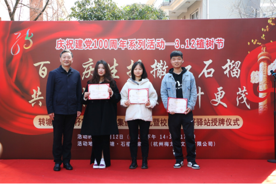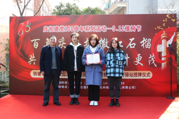 2021年3月12日下午,由西湖区转塘街道党工委主办的主题为“百年庆生播撒红石榴,共同体家园根深叶更茂”——庆祝3.12植树节暨转塘•石榴籽家园LoGo征集颁奖典礼及校园石榴籽驿站授牌仪式在位于杭州梅龙茶文化有限公司的转塘•石榴籽家园隆重举行,来自政府、企业、高校等社会人士共同参加了此次活动