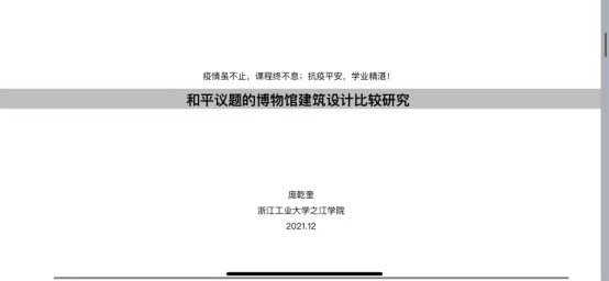 上好课程思政、讲好抗疫故事。在新冠疫情防控大考中,每门课都要守好一段渠、种好责任田,与疫情防控思政大课同向同心,协同将每一堂课转化为支持防控斗争的强大力量。为了帮助学生保持学习状态,建筑学院提前制定了线上教学预案,充分发挥线上课程在时空上的开放性和延续性特点,积极利用校内外在线课程资源、课程录像、线上答辩等多种形式推进在线教学。同时,疫情之下的在线教学也是高校课程思政的一次特殊的融入与加深,建筑学院专业老师们挖掘课程对学生价值引领的潜力,将家国情怀、责任担当、职业精神等核心价值元素在课程中自然呈现,引导学生坚定爱国主义情怀、讲好“抗疫精神”,指导学生结合所学专业知识,科学认识和正确对待新冠疫情,锐意进取,潜心学习。疫情期间正值国家公祭日,庞乾奎老师结合时政,开展了“和平议题的博物馆建筑设计比较研究”教学,成为这不凡冬日里,传承爱国主义精神最生动的课堂。