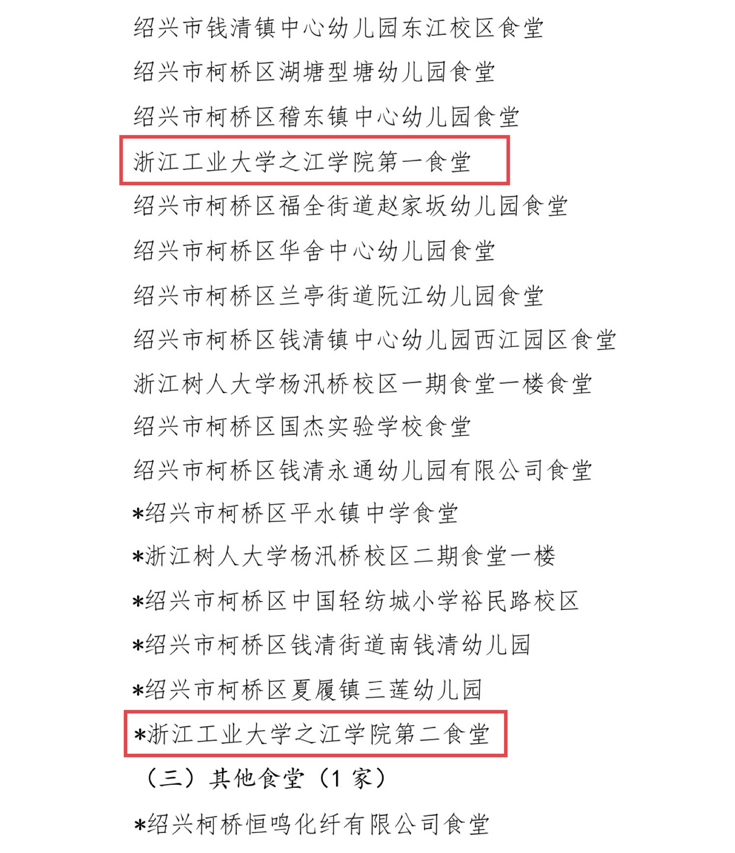 2021年度绍兴市餐饮服务食品安全“A级食堂”名单