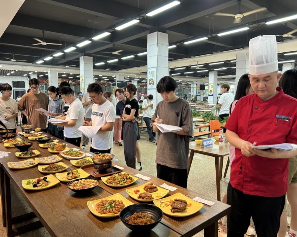 经过初赛的激烈角逐,共有来自各二级学院的12组选手进入了决赛比拼。活动现场紧张而有序,参赛学生按照比赛规则在规定的时间内同台竞技,展示精湛的厨艺。从刀切到下锅,从翻炒到配料,选手们手法娴熟、不慌不乱,吸引着各位评委及观众们的视线。许多看似简单的原材料,经过选手们的巧手加工制作,很快就变成了一道道色、香、味、型各具特色的菜肴。本次评审团由各餐厅厨师长和学生评审代表组成,通过“赏、闻、尝、品”等方面对各参赛作品进行打分评价。