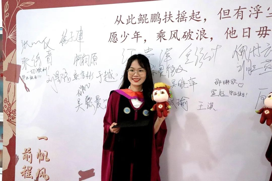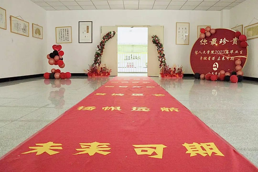 为了进一步营造毕业氛围,增强毕业仪式感,当天的人文学院布置一新,首先映入眼帘的是贴着祝福语的红毯,红毯尽头是玫瑰装点而成的鲜花拱门、气球装饰、合影留念板。走过红毯,毕业生们纷纷提笔在“你最珍贵”签名墙上留下对未来的期许、给学弟学妹的建议、对恩师的感激、或是送给母校的祝福。