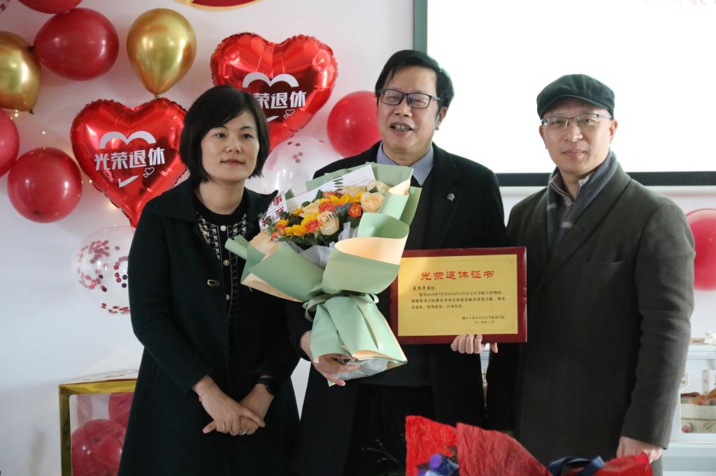 仪式上,商学院党政班子成员为唐根年教授送上了鲜花和证书。