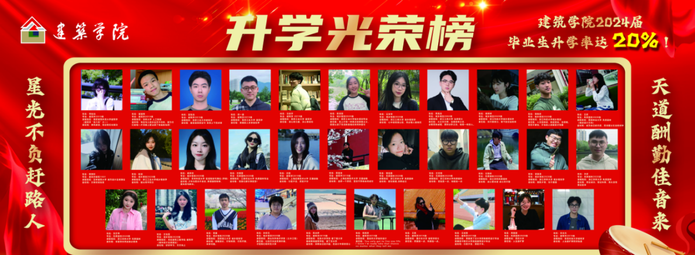 寒窗独耐三冬冷,折桂蟾宫一路春。随着全国2024届硕士研究生录取名单陆续公示,建筑学院2024届毕业生考研升学率捷报频传。建筑学院共32名学生考取国内外高校研究生,升学率再创新高,达到20%,其中风景园林专业升学率高达30%!学生分别被西安建筑科技大学、深圳大学、南京工业大学、浙江工业大学、西南林业大学、美国南加州大学、英国伦敦大学学院、悉尼大学、等国内外知名高校录取。