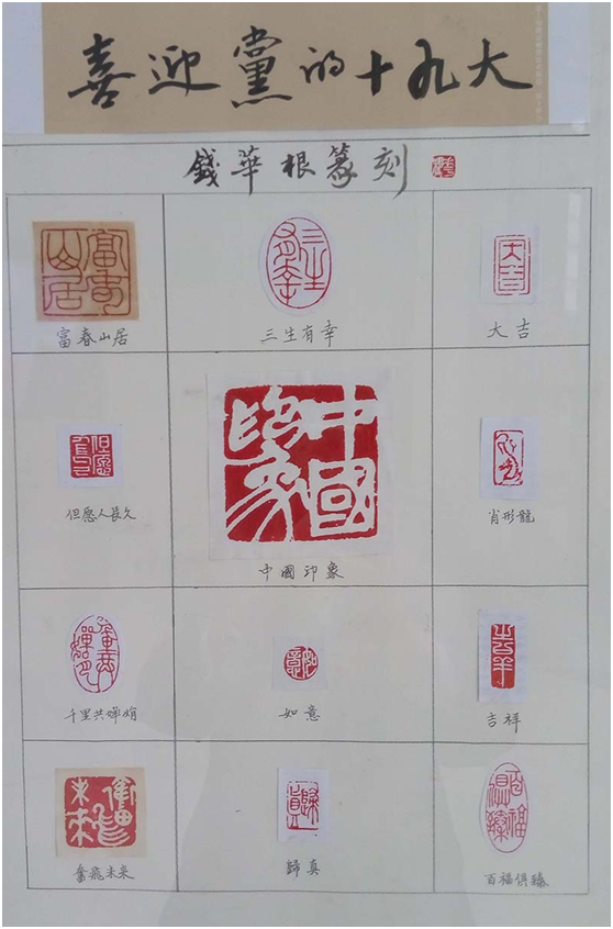 钱华根老师的小篆书法作品写的是朱德将军的诗:“伫马太行侧,十月雪飞白,战士仍衣单,夜夜杀倭贼”,小篆线条自由,整幅字以泼墨的形式,气势雄伟,又不失其笔法,艺术效果强烈,壮观,气魄。反映了中国共产党为了民族解放,带领全国人民不畏艰难困苦的革命乐观主义精神。曲哲老师的水彩风景画描绘了现代农家住宅的大气和优美,屋旁小桥流水,人与自然的和谐相处,让人感觉到如今的生活水平达到了很高的程度。