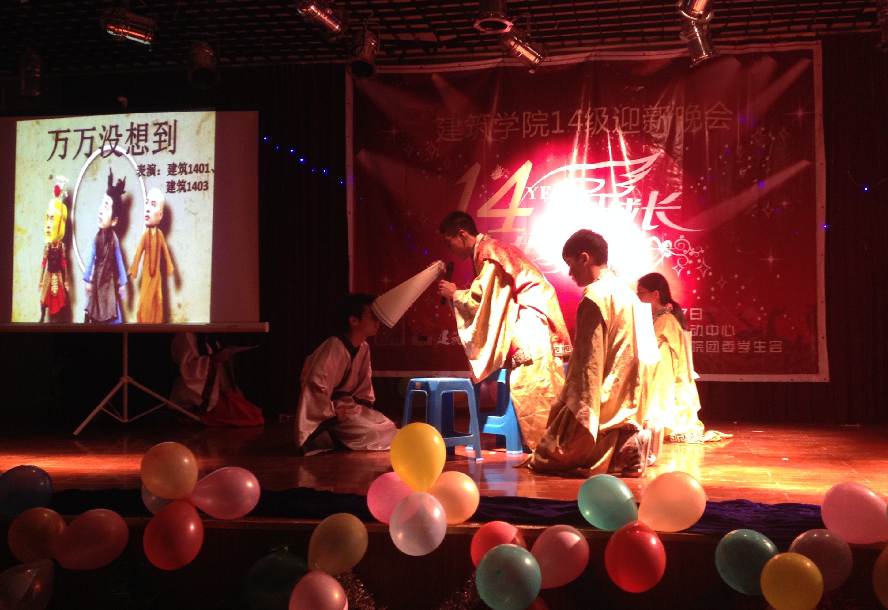 随着星工场暖场舞的激情,晚会拉开帷幕。欢呼声中,4位主持人闪亮登台,他们是建筑学院“首届主持人大赛”中的获胜者。晚会上,新生十佳和文艺部长倾情献歌,再现柔情。邓读会《新闻直播间》、建筑1401&1403《万万没想到》、景观1401《最强选秀王》等小品和话剧妙想连篇,充分展现了建筑学子的创造力,赢得阵阵欢笑。由城规1401和建筑1402排演的情景剧《同桌的你》则颇为走心,感人至深。丰富多彩的游戏环节充满互动,师生同乐于“匿名悄悄话”、“抢凳子”等节目,亲密无间。当大合唱《黄种人》的演员们穿上院服、敲响雄壮的鼓声时,晚会走向了动人的高潮。