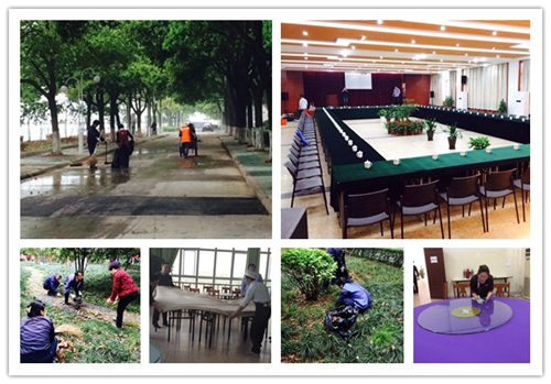 校园保洁是物业管理部的常规工作,这个时节的江南正是落叶纷飞的季节,校园内遍地的落叶需要一遍遍重复的清扫。接到会议安排后,所有物业的员工们放弃周末休息时间开始加班加点的干开了,绿化带内矮灌木丛里的陈旧树叶,道路两侧长年累月积累下来的白色垃圾,校园改建后遗留下来的卫生死角,主干道上错落不齐的横幅、喷绘,拔杂草,扛石块,个个干的满头大汗,当天,共清理垃圾、树叶130余袋;水电维修组变身“泥瓦队伍”,修路的修路、铺鹅卵石的铺鹅卵石,把校园主干道和各个角落的“坑坑洼洼”补了个齐齐整整。17日早晨6点开始,从物业的分管领导到管理员到清卫员,每个人都化身成校园的清卫战士。河道边、树荫下、操场边、绿化带内,他们穿梭在校园的每个角落,左手一个袋子,右手一个火钳,在会议开始前进行着最后一遍的清理。