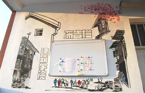 “走在朝晖大道仰望1E五楼时,我见到了壁画的一角:是墨色的屋檐与粉色的花枝。上楼探究,才发现了这个布告栏。嗯,画得真美!”一位路人告诉笔者。城规1301班的俞力婷说:“这布告栏是我同学亲手绘制的,独一无二。每次给朋友看,总觉得特别骄傲!” 景观1301班的孙炜是布告栏的绘制者之一,他介绍说:“我们在构思时,希望把布告栏设计得既有个性,又有特色,于是想到了画民居……”