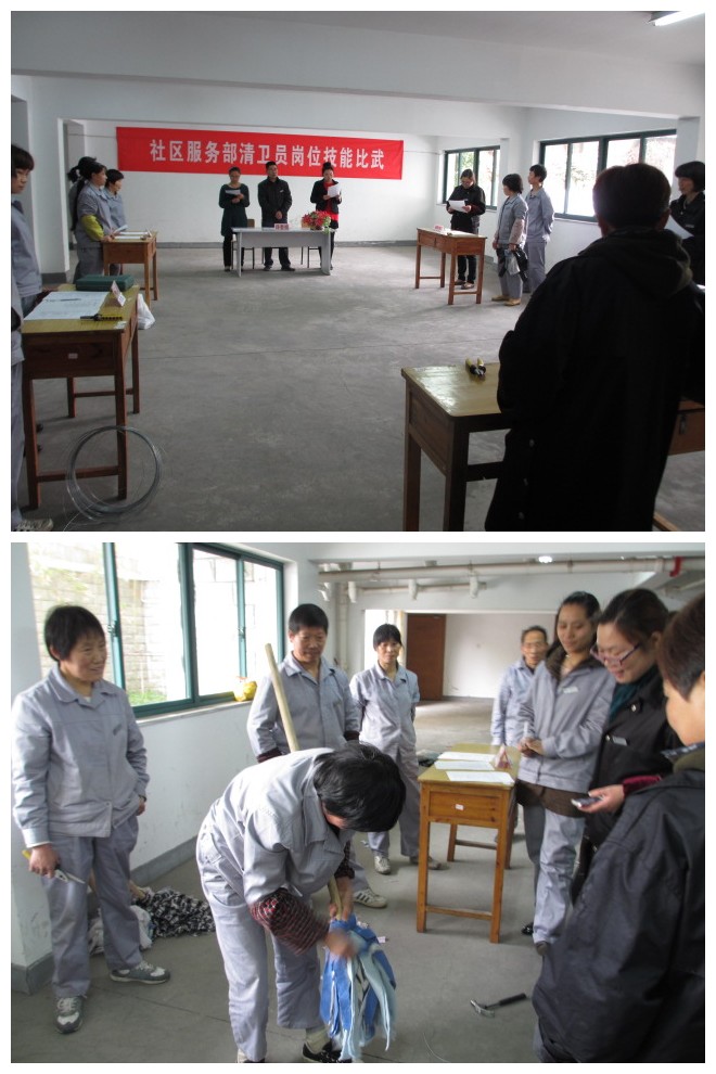 本次技能比武主要分为公共区域卫生清洁和清卫员自制拖把比武两个部分。技能比武中,选手们由各公寓楼管理员带队,分成五组进行比赛。在公共区域清洁比赛中,大家动作娴熟、你追我赶、干劲十足,比赛紧张而有序;在自制拖把比武现场,各参赛员工利用收集的废旧材料,不到十分钟,一把把结实耐用的拖把就呈现在评委面前。整个比武过程历经两个半小时,气氛活跃、有条不紊,充分展示出员工们良好的工作状态。经综合两部分评分,朱春娥、胡美良、鲍美姣三名员工分获一、二、三名。