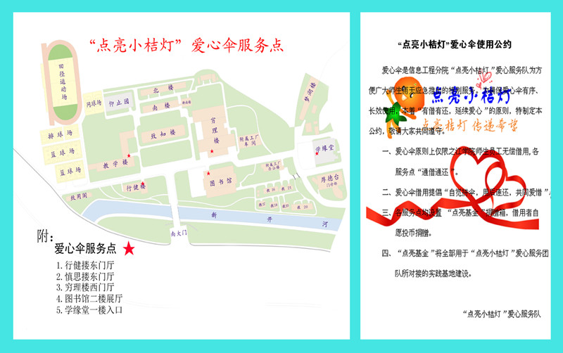 自2012年4月开始,分院又启动了“点亮小桔灯”爱心伞服务活动,在学院的行健楼、慎思楼、穷理楼、图书馆以及学缘堂门厅等处放置爱心伞,供师生免费借取。首批投放130把,并在各宿舍楼门厅设立了爱心伞回收桶,由志愿者定期维护。新学期开始后,志愿者们对服务点的雨伞进行了清点和维护,并再次投放60把新伞。