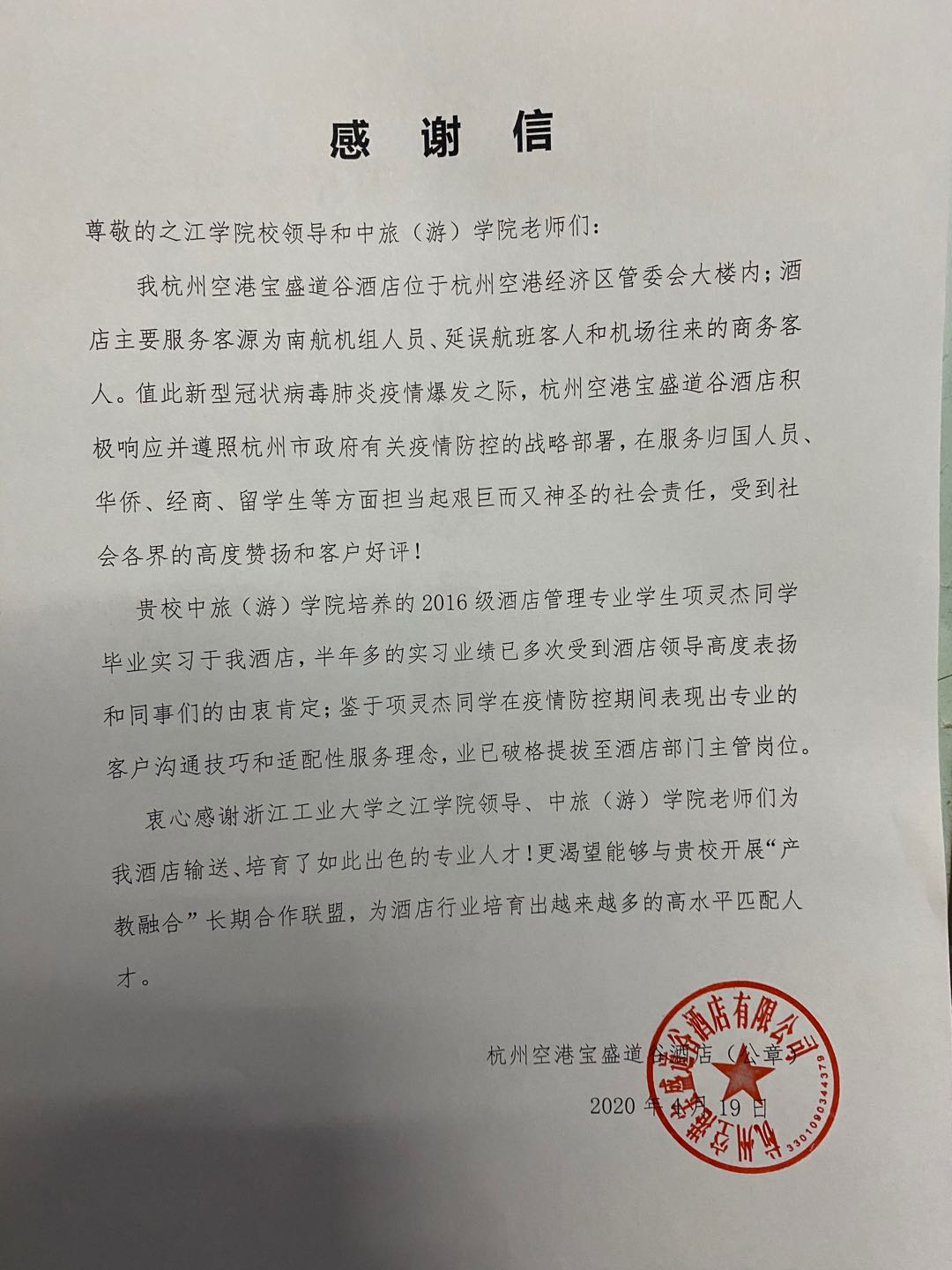 近日,中旅(旅游)学院收到来自杭州空港宝盛道谷酒店关于优秀学子项灵杰在毕业实习期表现优异且在疫情期间勇于担当,积极参与防疫工作的感谢信。