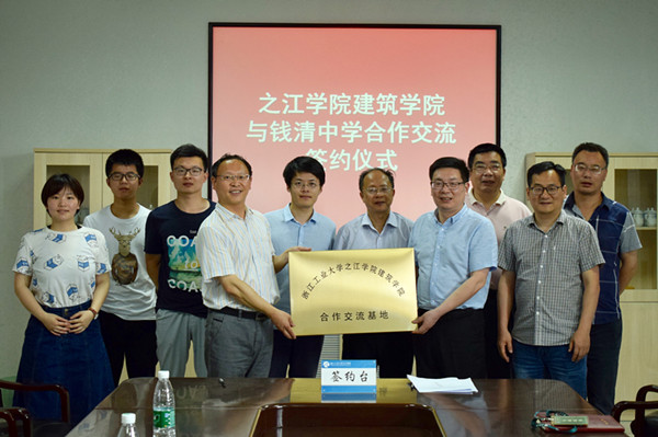 5月22日,建筑学院党总支书记一行5人再赴柯桥区钱清中学,在双方前期洽谈的基础上,签订了校地合作对接交流协议,并举行“浙江工业大学之江学院建筑学院合作交流基地”授牌仪式。钱清中学校长胡木强、书记朱月星等全体班子成员参加了仪式。