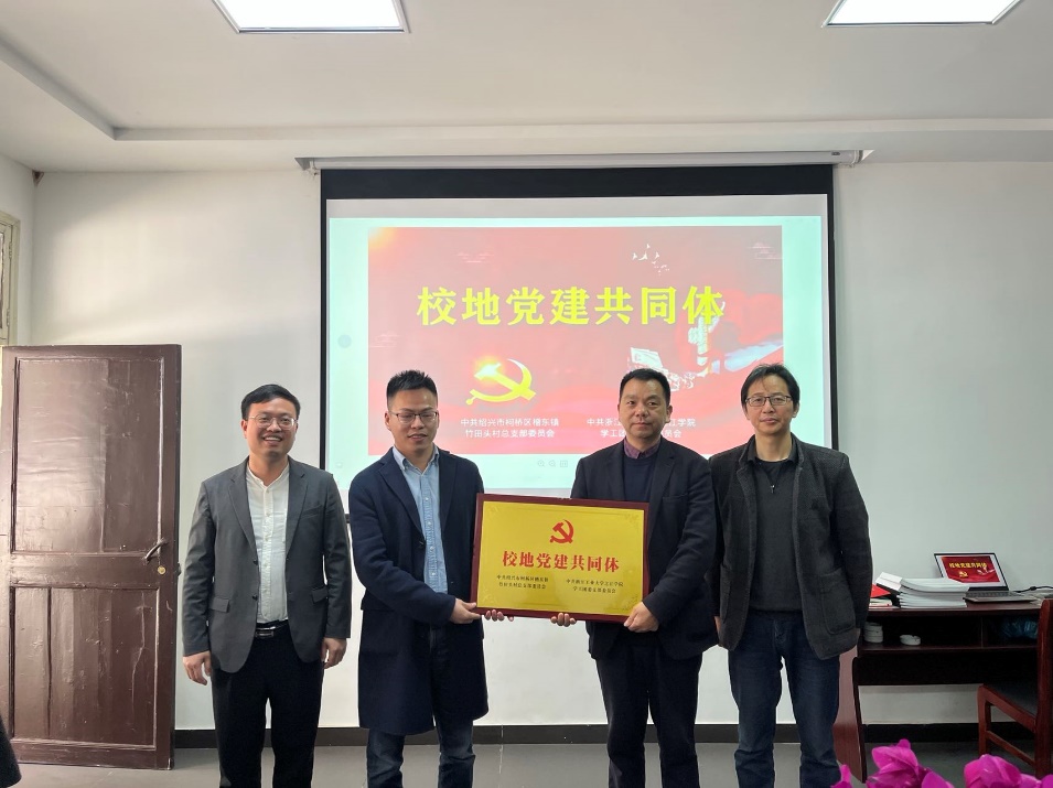 为深入学习贯彻党的十九届历次全会精神,赓续红色传承,激发支部活力,深化校地合作,凝聚奋进力量,彰显使命担当,大力推进党建工作与中心工作的深度融合。近日,学工团委党支部赴稽东镇竹田头村开展“校地党建共同体”共育对接并进行授牌仪式。稽东镇镇长吴华军、人大副主席黄杨钦、竹田头村党总支书记商建亮等接待并参与对接活动。