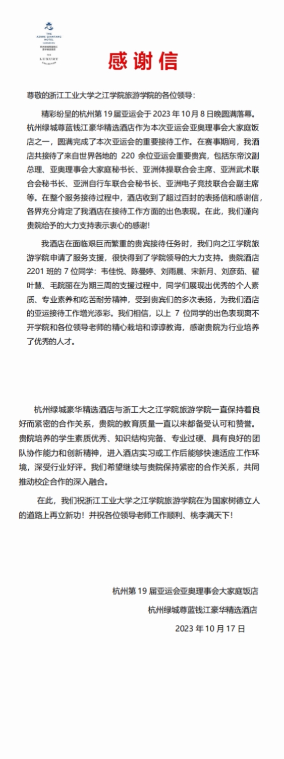 杭州第19届亚运会是党的二十大胜利召开之后我国举办的规模最大、水平最高的国际综合性体育赛事。杭州绿城钱江尊蓝酒店作为本次亚奥理事会大家庭饭店之一,担当起了本次杭州亚运会的重要接待任务。我院酒店管理22级的刘彦茹、翟叶慧、毛院丽、刘雨晨、宋新月、韦佳悦、陈曼婷这七位同学积极参与了酒店餐饮部接待的一线任务。经过严格的培训后,她们平时负责接待亚运重要外宾、与外宾进行英文沟通交流、为所有用餐客人提供温馨周到的服务。接待工作中,收到了来自客人的表扬与感谢,这七位同学以身作则,完美展示了专业技能的优秀风采,体现了之江学子的奋勇争先,永立潮头,不怕苦不怕累的美好品德。