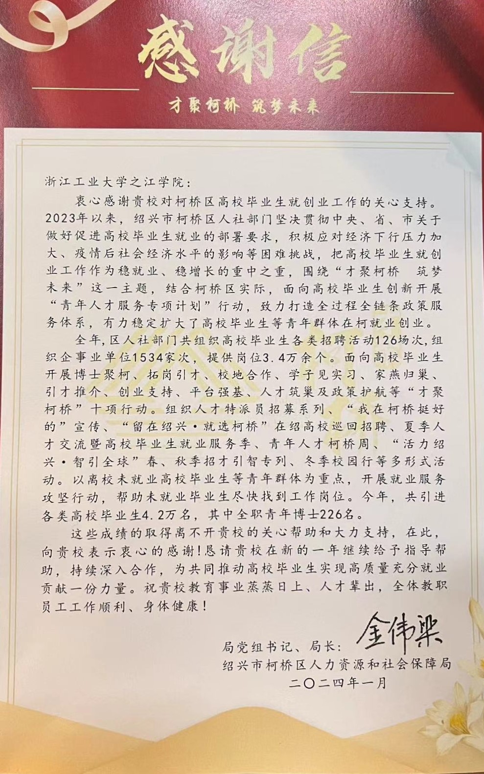 近日,我院收到绍兴市柯桥区人力资源与社会保障局发来的感谢信,对我院就业创业工作予以充分肯定,赞扬了学院积极推动高校毕业生实现高质量充分就业而作出的突出贡献,表达了对学院就业育人工作的衷心感谢。