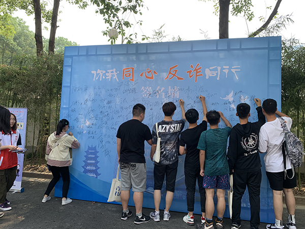 9月26日中午保卫部联合黄社溇社区举办了一场“你我同心、反诈同行”大型签名活动。本次活动得到了师生们的积极响应与支持,他们纷纷表示要让更多的人知道虚假信息的危害,提高自身警惕性,不轻易相信网络信息,能辩识出虚假信息,不传播虚假信息,呼吁大家可以明眼净心,预防电信网络诈骗,从自身做起。打防通讯网络诈骗犯罪被列入绍兴市2019年十大民生实事项目,全市、全社会掀起反诈宣传热潮,旨在通过此举提高广大人民群众的防范能力,有效降低网络诈骗犯罪发生率。