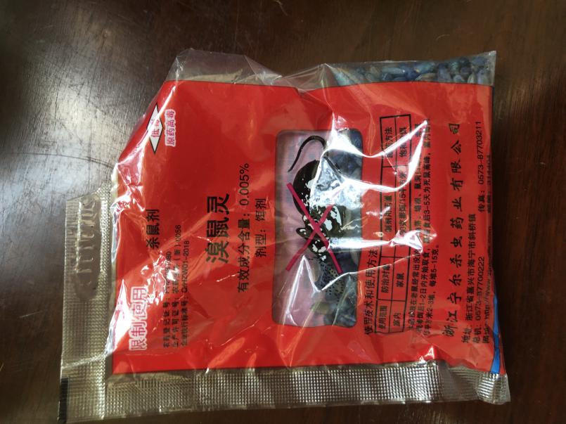 二、投放药饵:本次灭鼠使用的药物成分为0.005%溴鼠灵,警告色为蓝色。