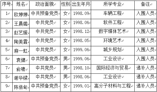 根据“浙江工业大学之江学院2021年在院内优秀应届本科生中公开招聘辅导员的公告”,经报名、资格审查、面试、考核,现确定下列人员为我院拟聘用人员(含递补)并公示如下: