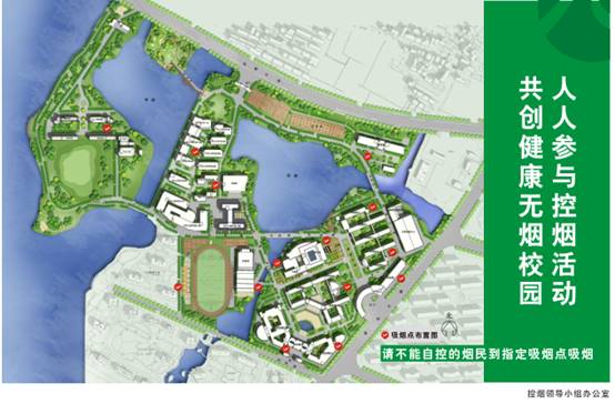 为更好贯彻《浙江省爱国卫生条例》、《浙江省爱卫办 浙江省文明办、浙江省卫生健康委关于开展浙江省无烟党政机关建设活动的通知》等文件精神和落实我院控烟工作要求,根据无烟学校(高校)的参考标准,学院控烟领导小组办公室在露天、通风、偏僻的地方设置了14处吸烟点,具体位置如图所示。请全体师生员工遵守《之江学院创建无烟校园实施方案》规定,人人参与控烟活动,共创文明无烟校园。