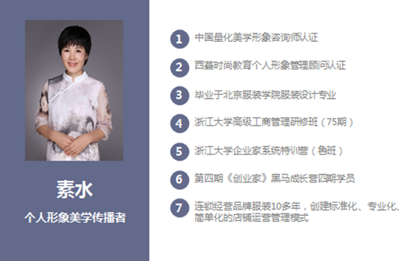 素水老师(滕赛雪),十多年来致力于形象美学的实践与运用,为几百位服装专业从业人员培训个人形象美学专业课程,更为几千位终端客户提供形象顾问指导。