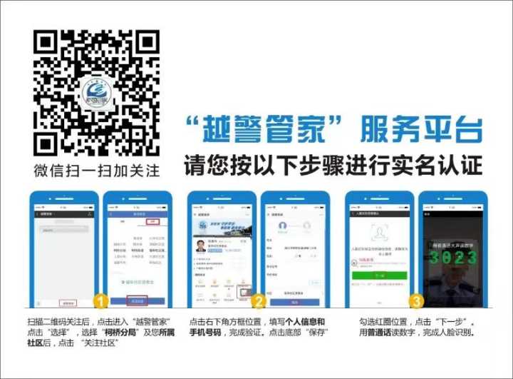 关注“越警管家”具体流程按以下步骤进行(关注时请选择学校所在的柯桥街道,黄社溇社区)。
