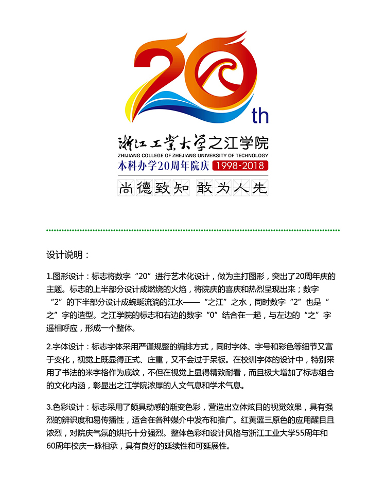 浙江工业大学之江学院本科办学20周年院庆标识征集活动启动以来,受到了我院广大师生、校友以及社会各界人士的积极响应。经专家初评,学院遴选出4件作品作为群众投票作品。根据征集活动评选办法,采取专家评审与群众投票相结合的方式确定获奖作品。投票作品如下(排名不分先后):