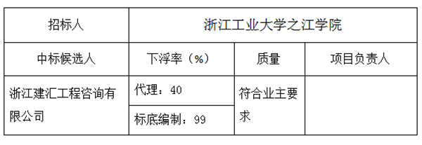 浙江工业大学之江学院学生公寓(早湖1号楼)新建工程招标代理及标底编制项目,于 2019年 7月10日在浙江工业大学之江学院行健楼111室公开开标,按招标文件规定的评标办法,已确定第一中标候选人,现将有关内容公示如下: