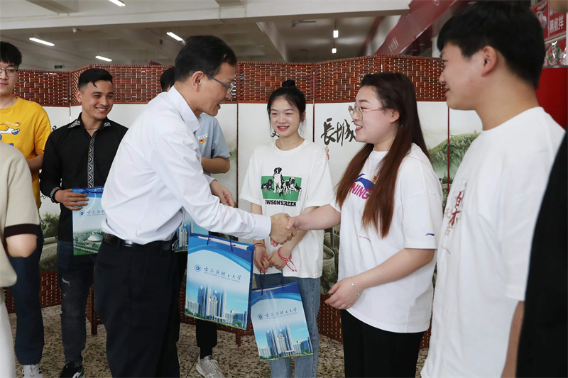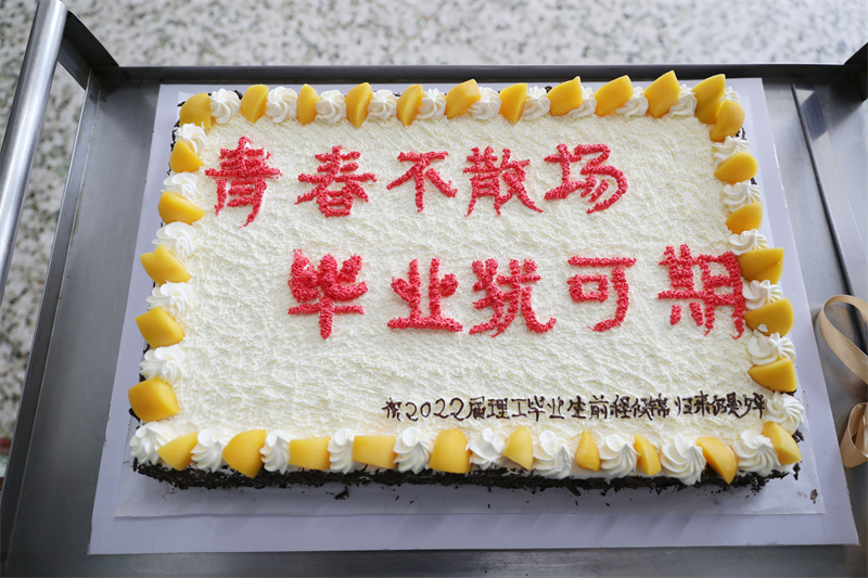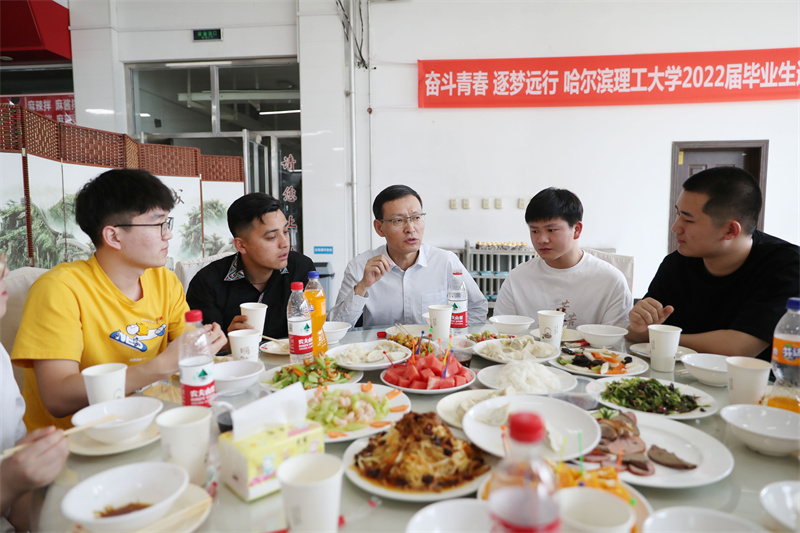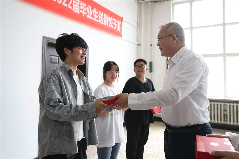 学校领导与毕业生们边吃饺子边亲切交流,祝贺毕业生们完成了四年的学业生涯,了解大家毕业去向和未来的打算。赵琳书记代表学校向即将毕业的同学们表示衷心祝福,对此次活动筹备而辛勤工作的人员表示衷心感谢,并为毕业生们送去了临行前的嘱托与期许。希望哈尔滨理工大学的“骄子”能够牢记母校“知行统一,博厚悠远”的校训,传承大珩精神,坚定理想信念,担当起民族复兴的时代重任,用勤恳的努力实现自己的人生价值,书写人生新篇章,在不同的工作岗位上展现青春风采;祝愿同学们展现出奋斗的青春,奔跑出最好的成绩,期待着同学们捷报频传,母校永远惦念着你们;希望毕业生们牢记来自母校的浓浓情谊,在前进路上乘风破浪、永远追光,并期待同学们常“回家”看看。毕业生们也纷纷表示,感恩母校的培育和对毕业生无微不至的关爱,祝福母校桃李满天下,并表示未来在工作岗位上定会不忘初心,做一名对社会有贡献的人!席间学校领导为在场的毕业生分享象征着“毕业祝福”的精美蛋糕,为5名幸运毕业生颁发毕业祝福卡片以及带有校徽的纪念礼盒,为每位参会的同学发放了防疫礼包。