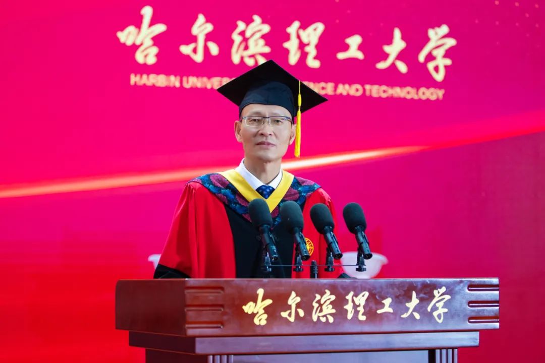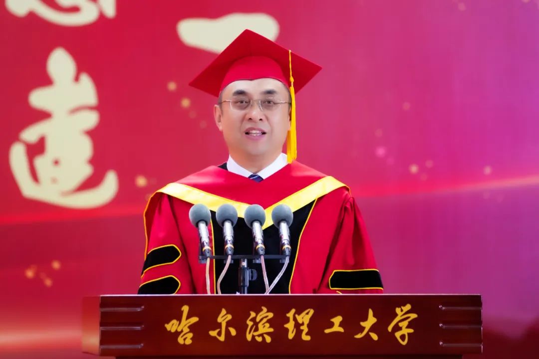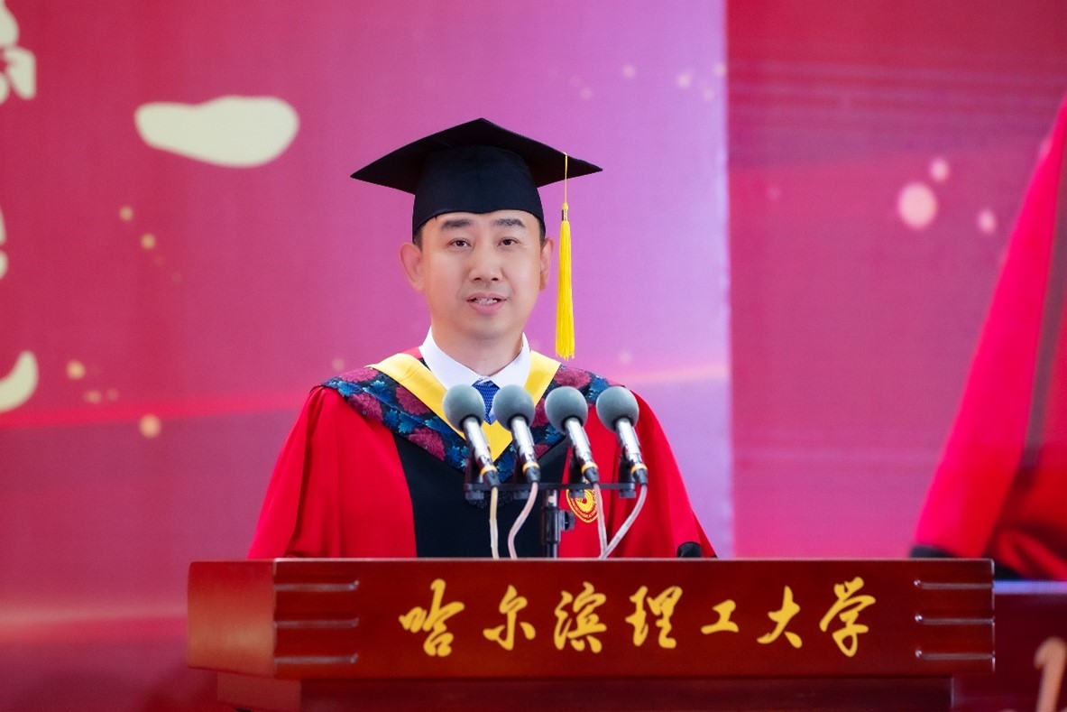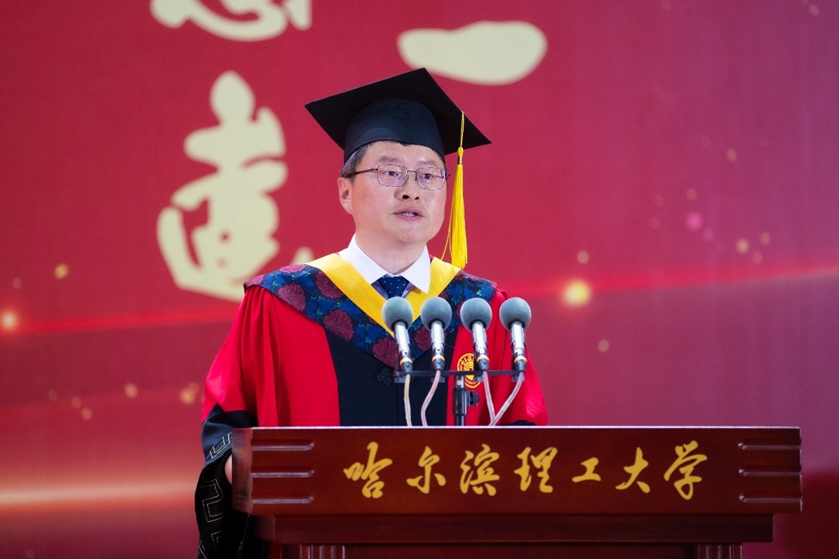 教师代表岳彩旭在典礼上发言。他回顾自己从哈理工学子到哈理工教师再到哈理工学者的20余年成长旅程,勉励同学们要胸怀祖国、志在四方,用智慧和汗水为新时代的发展贡献哈理工力量;要脚踏实地、服务奉献,不管身在什么行业、从事什么领域,都要永远保持哈理工人求真务实的底色;要坚持学习、提升自我,不断更新知识体系,提升核心能力,并送给大家“四个一”祝福:希望大家都能选择一座宜居的城市,从事一份热爱的工作,找到一个心仪的伴侣,度过精彩的一生,用青春的汗水和智慧,书写新一代哈理工人的精彩篇章。