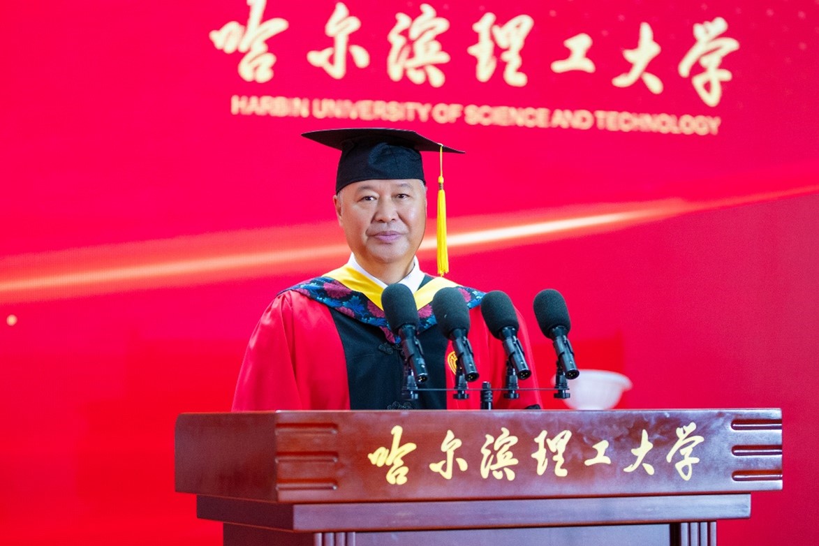 校友代表侯文奇在典礼上寄语学弟学妹。他回首在校园努力拼搏的求学时光并结合自己近三十年的创业历程,分享了个人的奋斗感悟,鼓励学弟学妹们要像野草一样坚韧,经得起考验、扛得起挫败;要像卫兵一样坚守,守得住初心、耐得住寂寞;要像狼群一样互助,扶得起同伴、拉得紧双手。在科技奔涌、机遇与挑战共舞的时代,愿大家身怀专业之能,心燃青春之火,勇具求索之心,以知识为桨,以勇气为帆,在时代的浪潮中奋力前行。哈理工人的每一次探索与突破,终将汇聚成母校的骄傲,熔铸为支撑家国的栋梁之材!