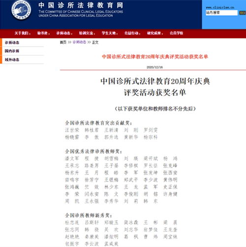 为回顾和总结诊所法律教育在中国20年的发展历程,经过CCCLE(中国法律诊所教育委员会)常委会决定,在中国诊所法律教育20周年庆典上,表彰一批优秀教师和优秀诊所教育单位,我校荣获两项殊荣,我校法律诊所荣获全国优秀法律诊所奖、我校教师李俊刚荣获全国优秀法律诊所教师奖。