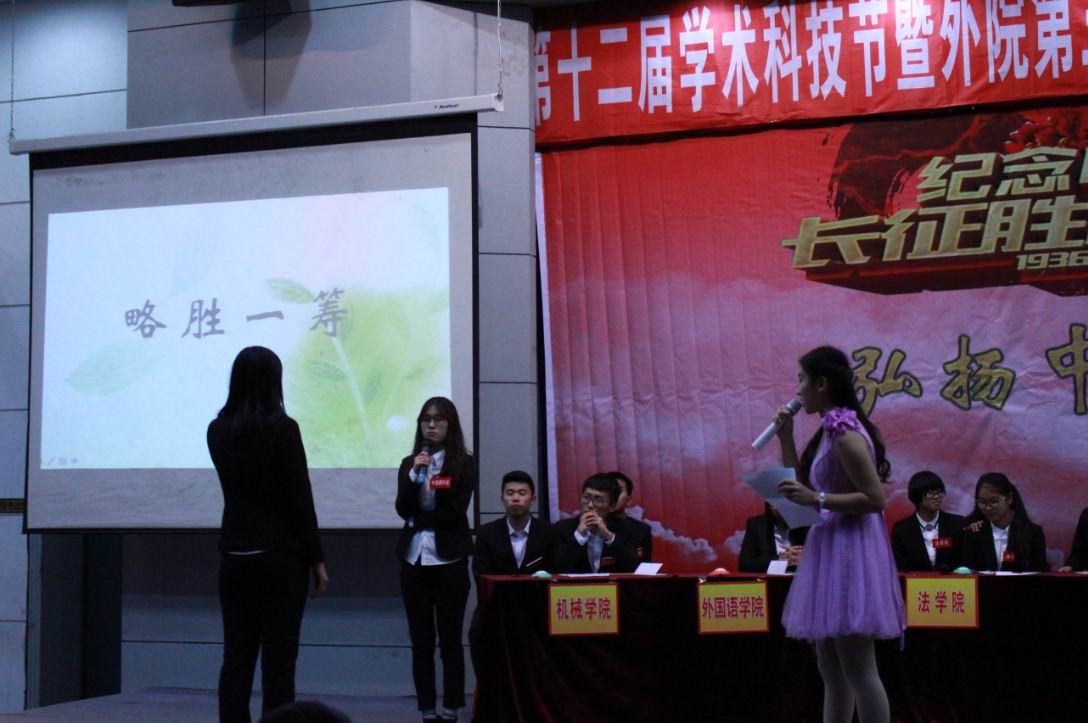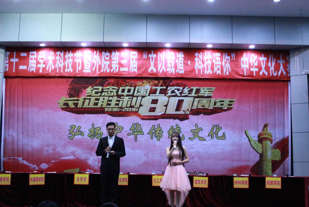 在纪念长征80周年之际,外国语学院于2016年11月19日晚6时在西区一号楼0220举办了第十二届学术科技节暨外国语学院第三届“文以载道•科技语你”中华文化大赛。外国语学院党委书记高秀江、校团委副书记姜国玉、外国语学院副院长郭红、党委副书记、副院长周晓丽,材料学院团总支书记武翠及学院全体辅导员出席了本次大赛。