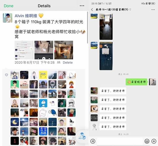 于立洋老师疫情期间肾结石病反复发作,但他没有请假,克服病痛一直坚持为学生整理物品邮寄行李。刘倩,冯月两位老师利用周末休息时间给学生邮寄行李,从早上8点半一直忙碌到傍晚时分才结束回家。在打包的过程中,对学生遇到的问题进行了耐心细致的解答,把学校相关政策和邮寄工作的初衷传达给学生,更好的推进邮寄工作的开展。辅导员郭宝鹏、邵明记老师前段时间刚刚结束研究生行李的邮寄,这次又第一时间报名参加了学院本科生行李邮寄工作。郭老师在七公寓学生寝室忙碌了几天后,脚上磨出了血泡,人也在这些天里消瘦了一圈。尽管很辛苦、很累,但是他却说:“和许多学生相处四年了,由于疫情毕业都难以再见上一面,心里一直觉得很遗憾的,也借这次机会力所能及给他们提供点帮助吧!”见证了老师们辛苦的邮寄,更真切地感受到了母校的温暖和关爱,视频另一端的同学们不禁感动万分。软件16—1班学生赵琳娜说:“今年云毕业的我们,收获到了最深切的感动。我可能永远也忘不了,视频的界面里,老师们忙碌着打包行李的身影,充满力量,高过人头的一摞包裹旁,老师们超级灿烂的笑容,她们真的像女英雄一样。冰冰老师和瑶瑶老师,谢谢你们,让我们在千里之外,感受到四年的回忆和温情,我的老师们,你们辛苦啦。”“辛苦了,老师”“谢谢老师”......一句句温暖的话语回荡在云端,同学们流下了不舍的泪水,他们满怀感激的道谢,让所有老师们都倍感欣慰!