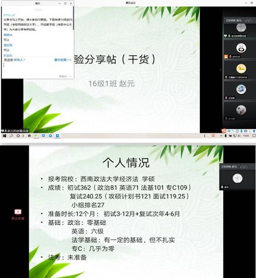 6月26日,法学院在腾讯会议上举办了考研经验分享会,学院各年级学生一百余人参加,由16级考取西南政法大学的赵元同学和中山大学的邓佳敏同学进行经验分享。