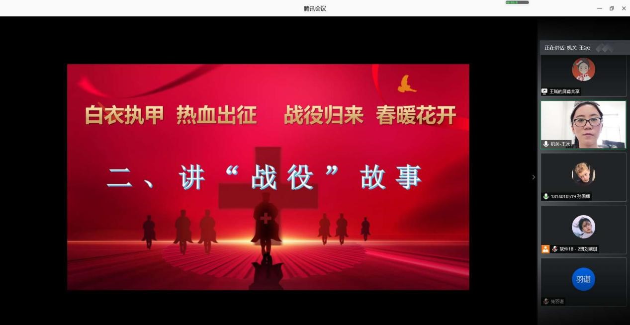 学生第二党支部书记王冰老师首先向最美逆行者致敬,己亥末,庚子春,新型冠状病毒感染的肺炎疫情牵动着无数国人的心。这不仅是对我国治理体系和能力的一次大考,更是对中华民族民族意志和民族精神的一次严峻考验。在这样的历史节点上,无数的英雄为了这场战役无声的斗争,有的甚至牺牲了宝贵的生命。接下来,王冰老师引出主题为“回顾战役故事 守望初心使命”故事交流会,学生第二党支部成员纷纷分享“战役”故事。