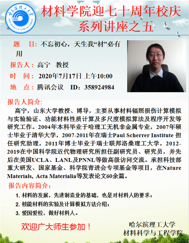 为庆祝学校建校七十周年,材料学院开展迎校庆系列讲座活动。7月17日10时,邀请哈尔滨理工大学无机非金属材料专业2004届毕业生、山东大学教授、博士生导师高宁作为演讲嘉宾,通过腾讯会议线上形式,以《不忘初心,天生我“材”必有用》为题,与我院无机非金属材料专业和高分子材料专业学生、教师进行了分享和交流,出席人数达125人。