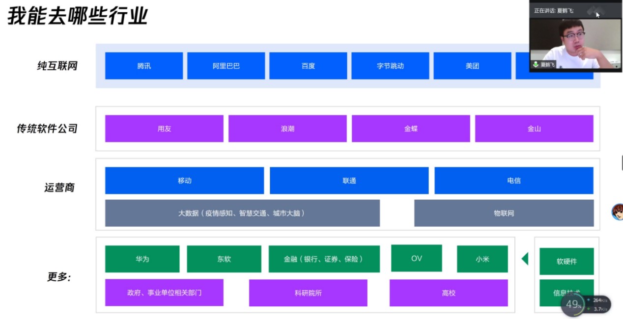 首先,夏鹤飞对不同行业进行介绍,为我们展示了毕业后可能的就业方向,总结出工作岗位中的“TPMDS”五大类:T族为技术族,需要熟练掌握算法,数据库,web开发等技能的后台工作;P族是关于产品项目,包括产品运营,产品功能等。M族是售前和市场类,相关工作是销售架构师等。帮助在校学生深入了解毕业后的就业方向:纯互联网,传统软件公司,运营商以及其他类。纯互联网中有许多我们熟悉的名企像腾讯、字节跳动等;同时还介绍了互联网和传统软件的区别:最直观的就是软件产品更新迭代的速度慢,互联网比较敏捷,更新速度快。