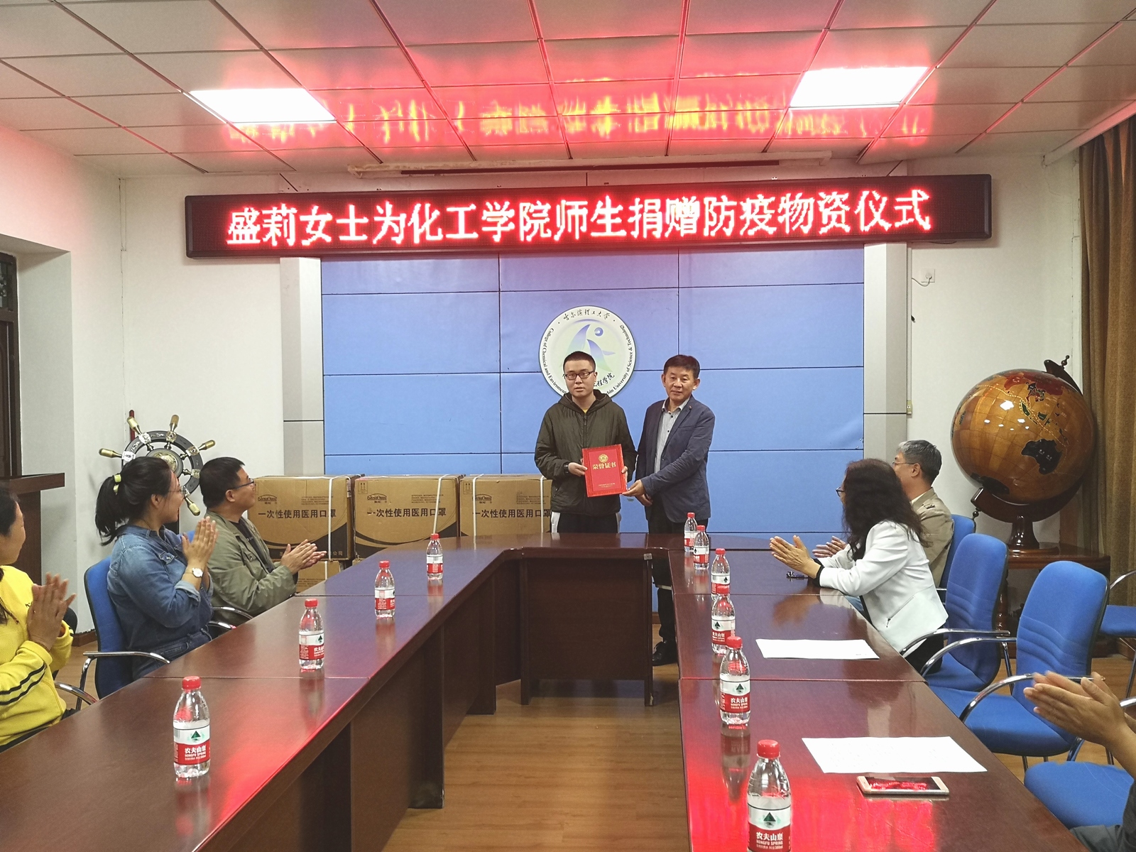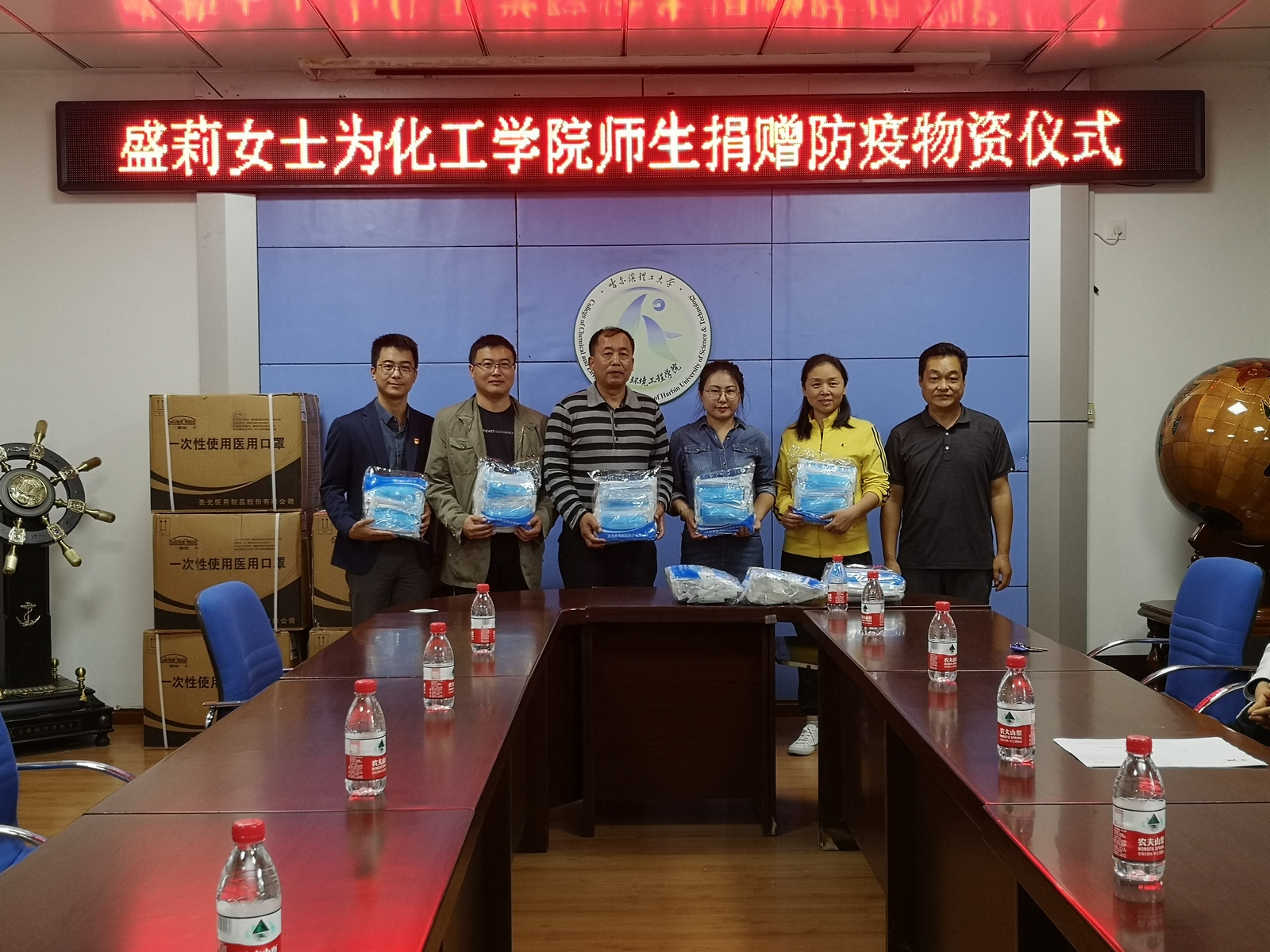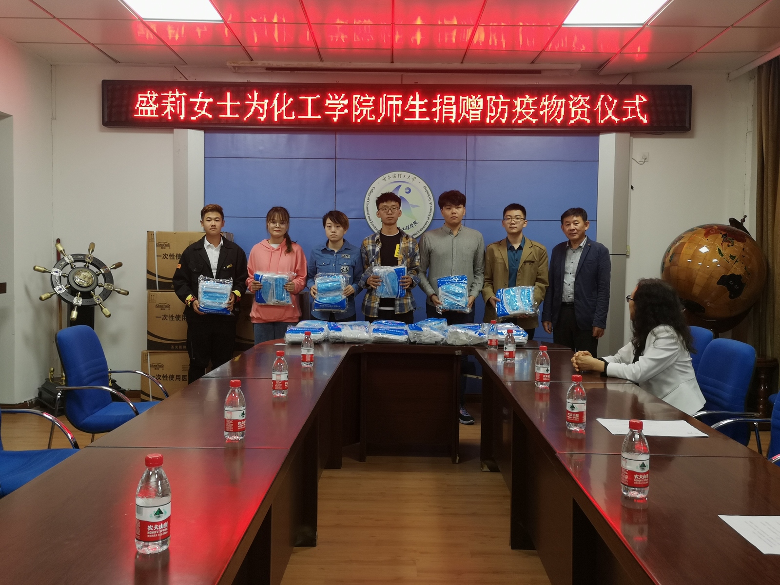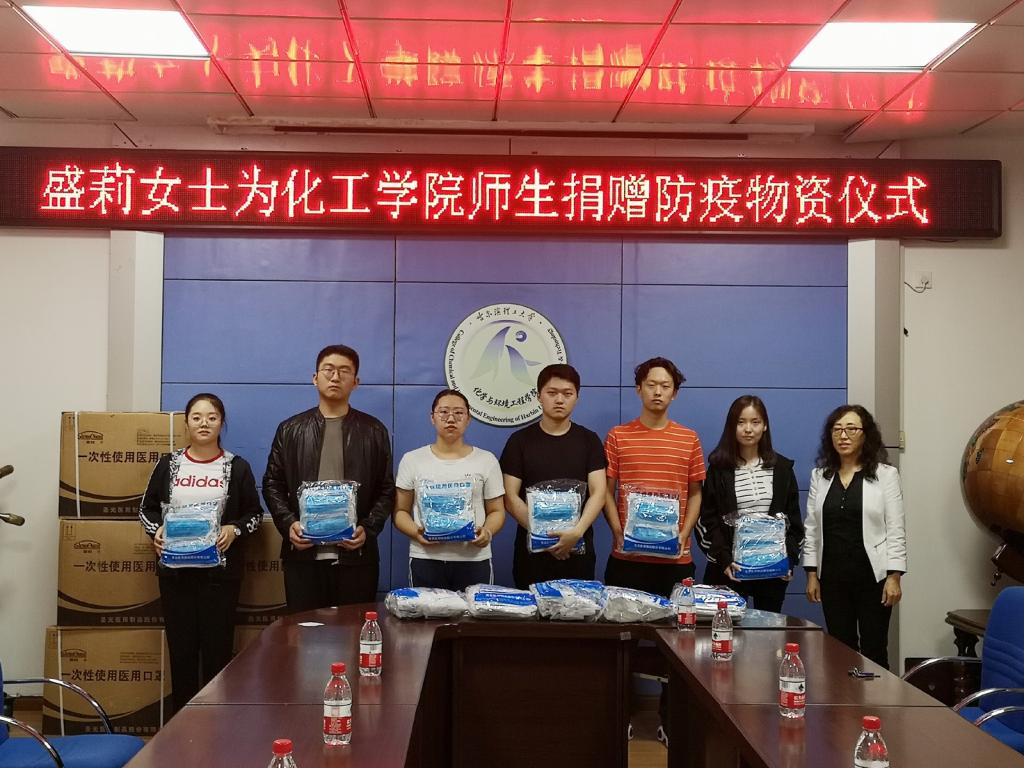 9月16日中午,学院举办了“盛莉女士为化工学院师生捐赠防疫物资仪式”,盛莉女士是我院食品18级1班文盛鑫同学的家长,为学院全体师生捐赠21600枚口罩。学院党委书记徐春霖、党委副书记高山、副院长马慧媛、文盛鑫同学、教师代表以及学生代表参加了此次仪式,仪式由学院党委副书记高山主持。