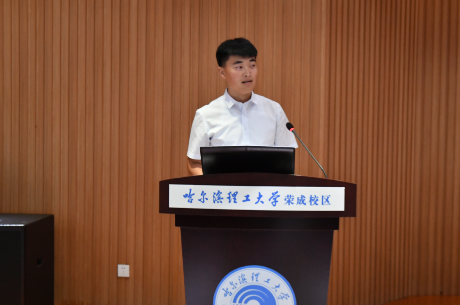 吴文芃代表新生发言。希望和同学们站在新的起点上,继续保持对学业的热爱,不断探索,不断提升,持续追求,全面提升个人综合素质和能力,植根荣成、再立新功!