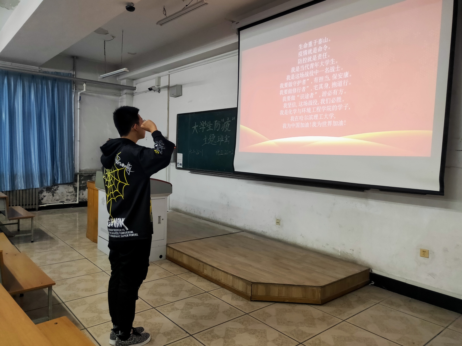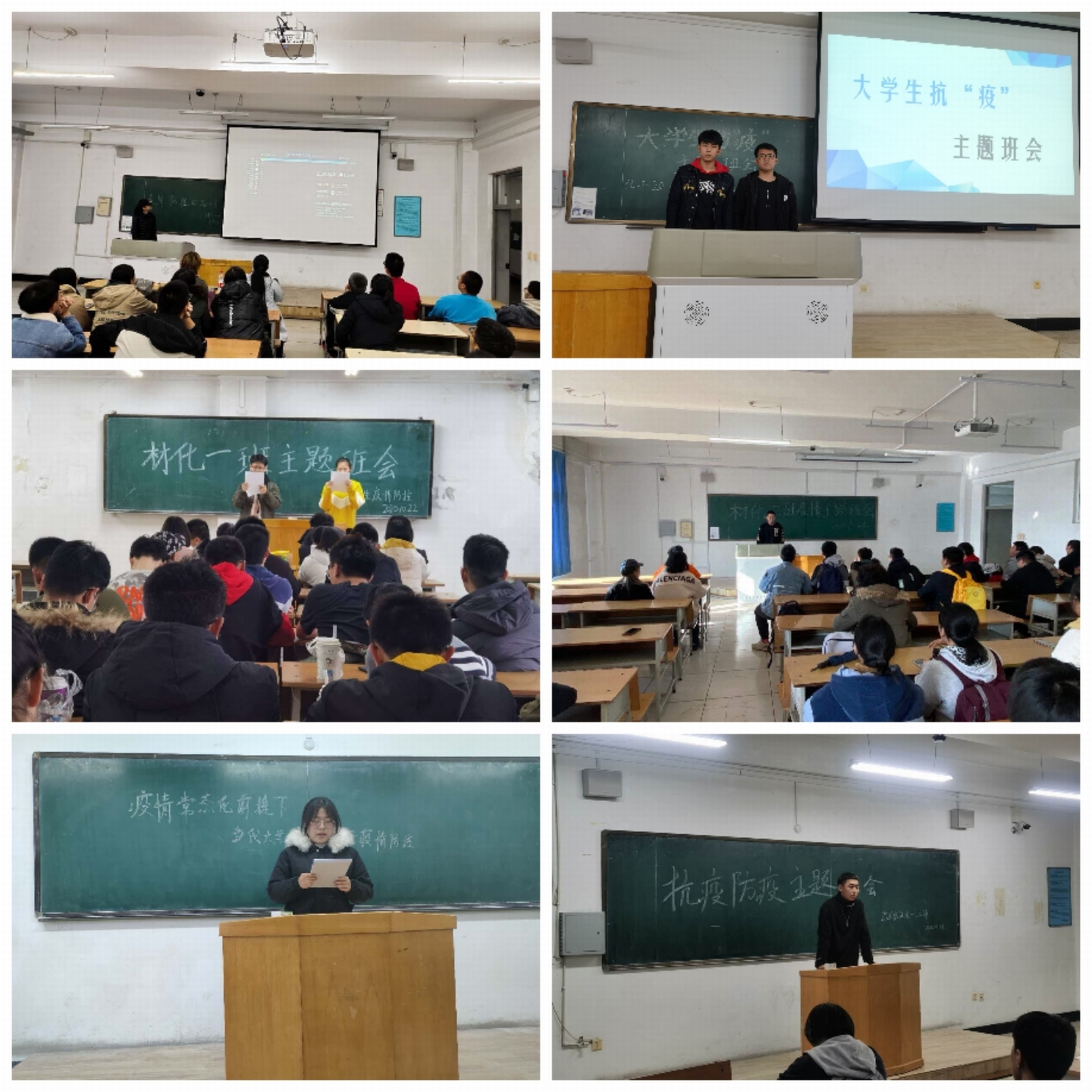 材化、化工、环境、制药四个专业新生以“大学生疫情防控”为主题开展了形式多样、丰富多彩的新生主题班会。