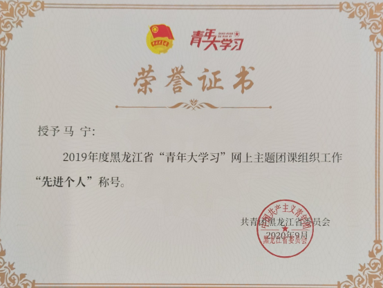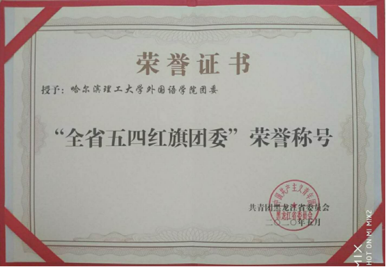 2020年5月,在团省委关于“黑龙江省两红两优”的评选中,外国语学院团委荣获“黑龙江省五四红旗团委”(全校仅一名);团委书记马宁同志荣获“全省优秀共青团干部”荣誉称号(全校仅两名)。