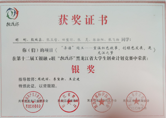 2020年由共青团黑龙江省委员会、黑龙江省教育厅、黑龙江省科学技术协会、黑龙江省学生联合会共同主办的第十二届工银融e联“挑战杯”黑龙江省大学生创业计划竞赛终审决赛中,由外国语学院党委副书记、副院长周晓丽指导的“异语”同工——重温红色故事,创绿色发展,逐龙江之梦”项目荣获银奖。