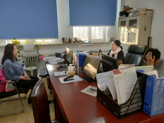 外国语学院毕业班辅导员李竖新与朝鲜语系主任车虎杰、俄语专业系主任徐佩交流就业情况