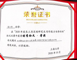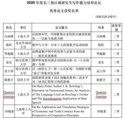 10月30日-11月1日,2020年度长三角区域研究生写作能力培养论坛在上海举行。我校外国语学院俄语语言文学18级硕士研究生孟立伟、金玄受主办方邀请参加论坛,并在征文比赛中喜获优秀论文二等奖。