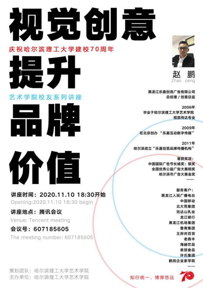 讲座中,赵鹏校友首先表达了对母校的感恩和思念之情,对母校70周年校庆表示了美好的祝愿。其次,赵鹏校友结合黑龙江外国语学院校园导视实际案例,从“艺术审美”、“创意方法”、“思维方向”三个层面分析阐述了如何通过视觉创意提升品牌价值,为学院师生上了一堂生动的设计课。最后,赵鹏校友表示,有时间一定回母校看看,并欢迎广大艺术学院教师前去参观考察,欢迎师弟师妹们去公司实习就业。